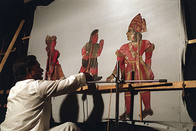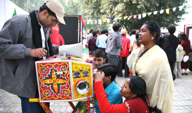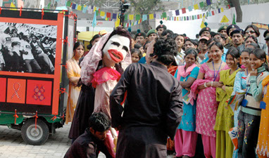 In India, puppeteers from Anurupa Roy’s Kat-Katha troupe entertain the crowd attracted by an ArtMoves display. The auto-rickshaw displays a photograph by South African photojournalist Gideon Mendel, taken at the 2000 World AIDS Conference in Durban, South Africa.