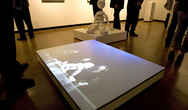 Parthiv Shah of CMAC and David Gere field questions in front of an ArtMoves display.